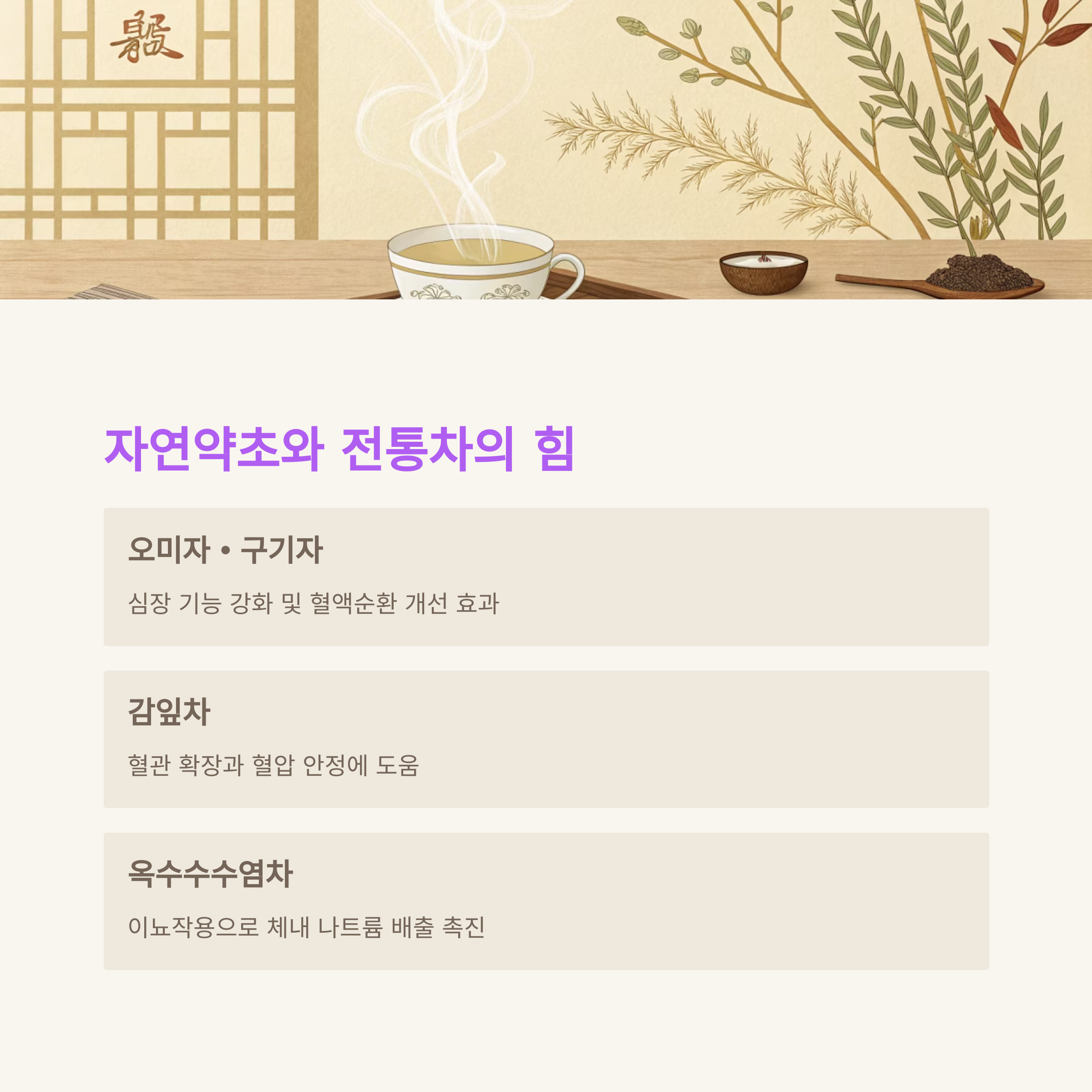 - 뽕잎차: 혈압 조절에 좋은 플라보노이드 함유