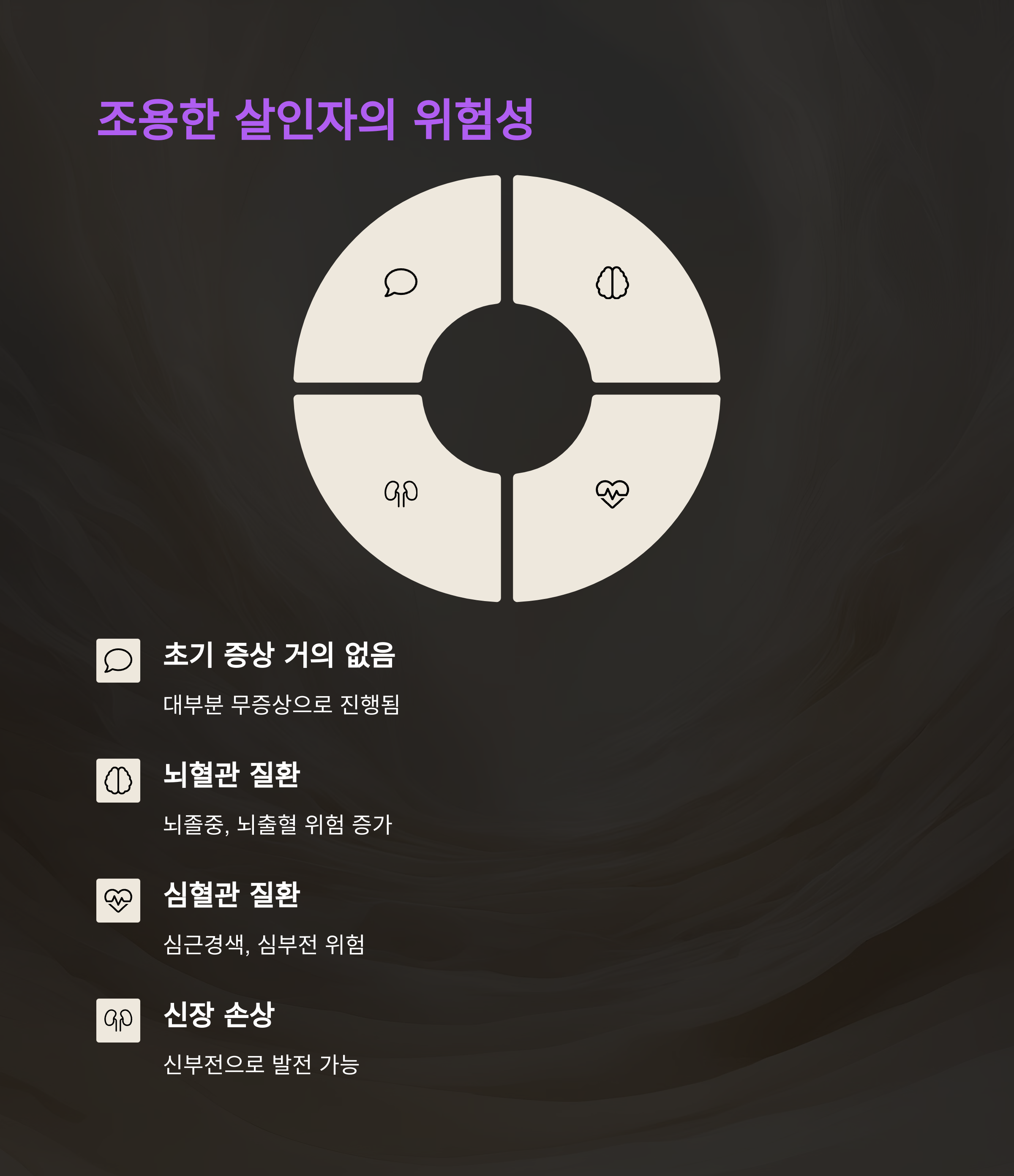 "겉으로는 아무 증상이 없어도 내부에서는 고요히 진행되는 위험한 질환"입니다.