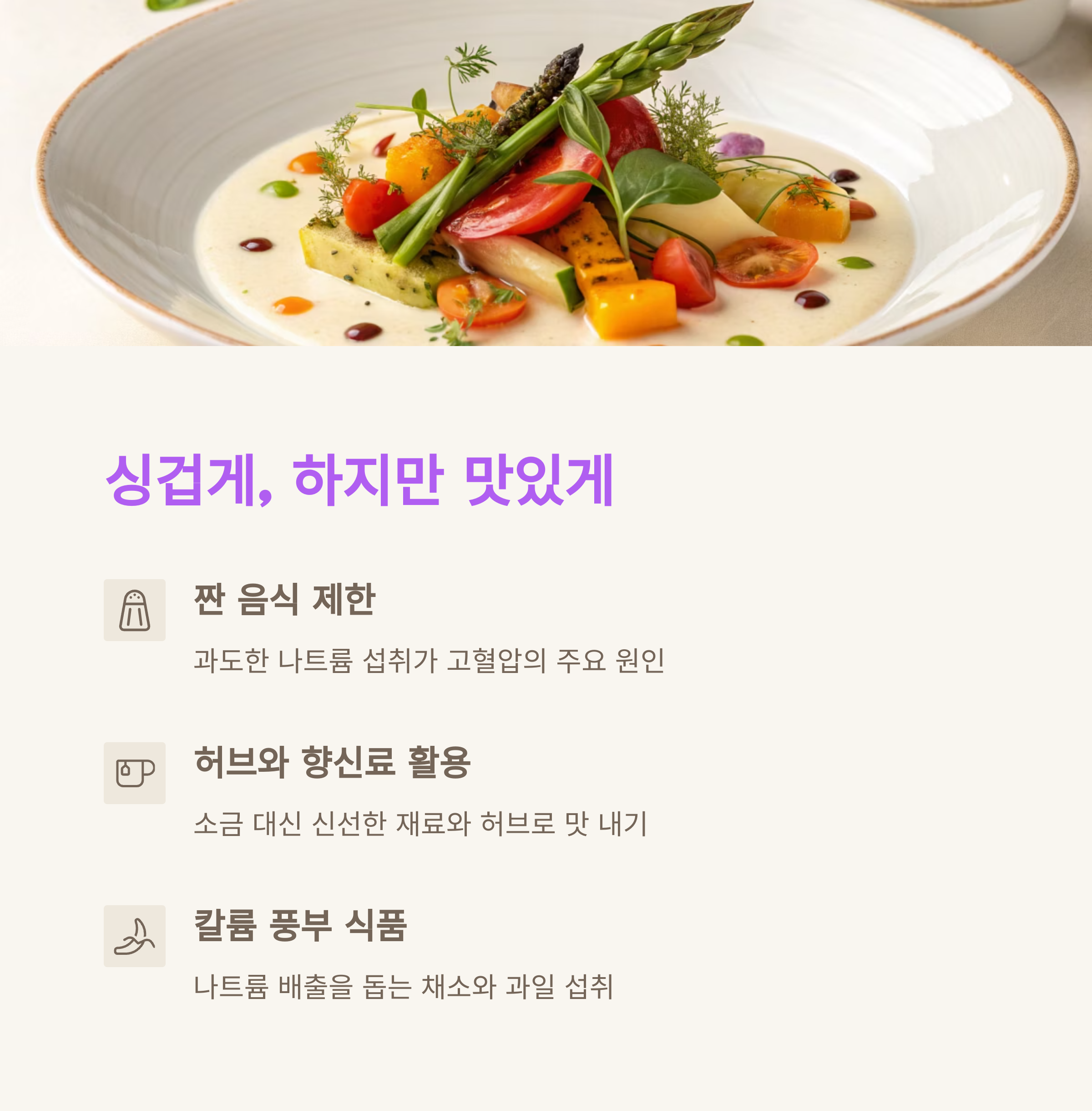 소금을 줄이고, 대신 허브나 향신료로 풍미를 살리는 방법을 추천드립니다.