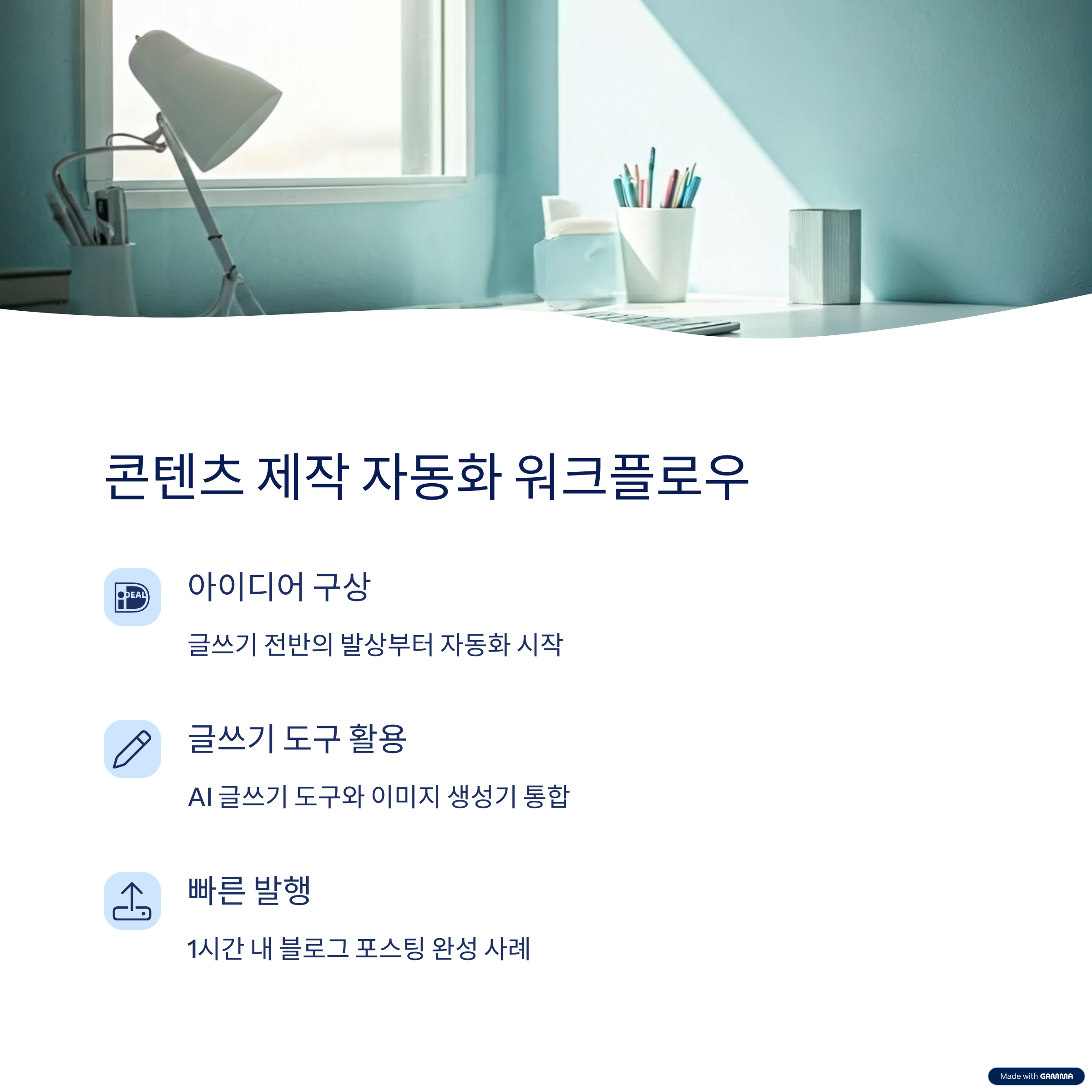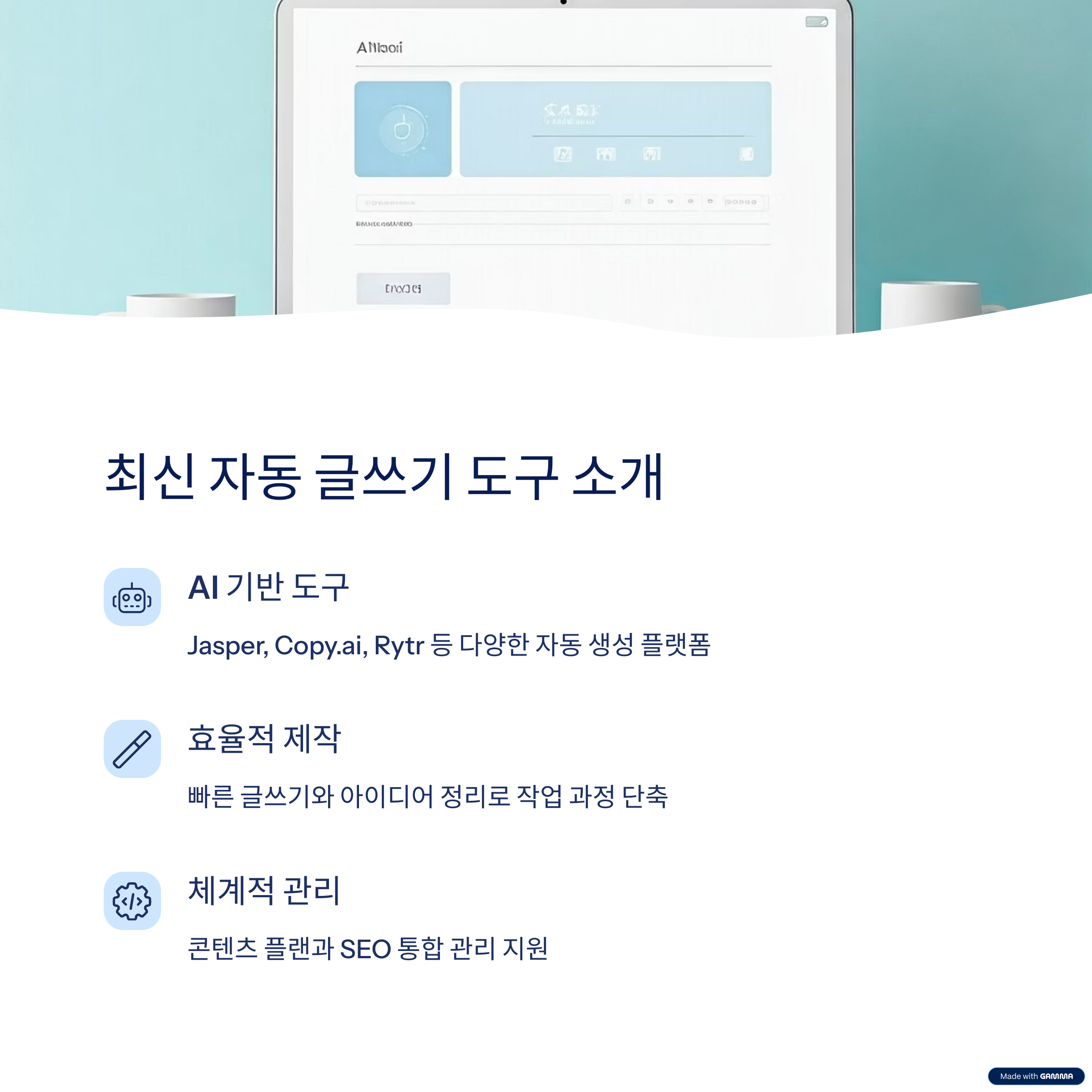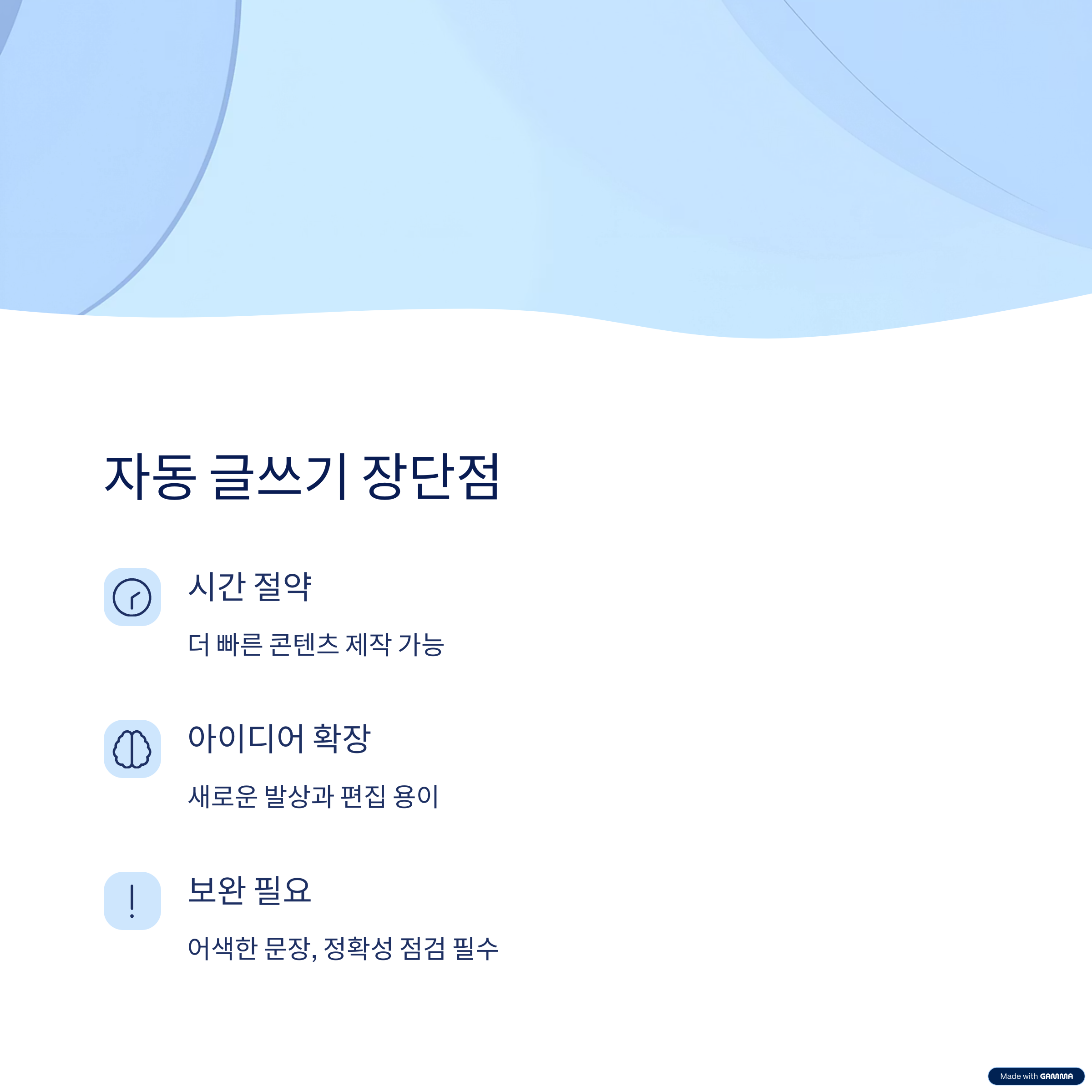 | 블로그, 뉴스레터, SNS 콘텐츠에 즉시 활용 | ChatGPT, Copy.ai, Notion AI 등 추천 | 퀄리티 유지하며 더 많은 콘텐츠 제작 가능 |