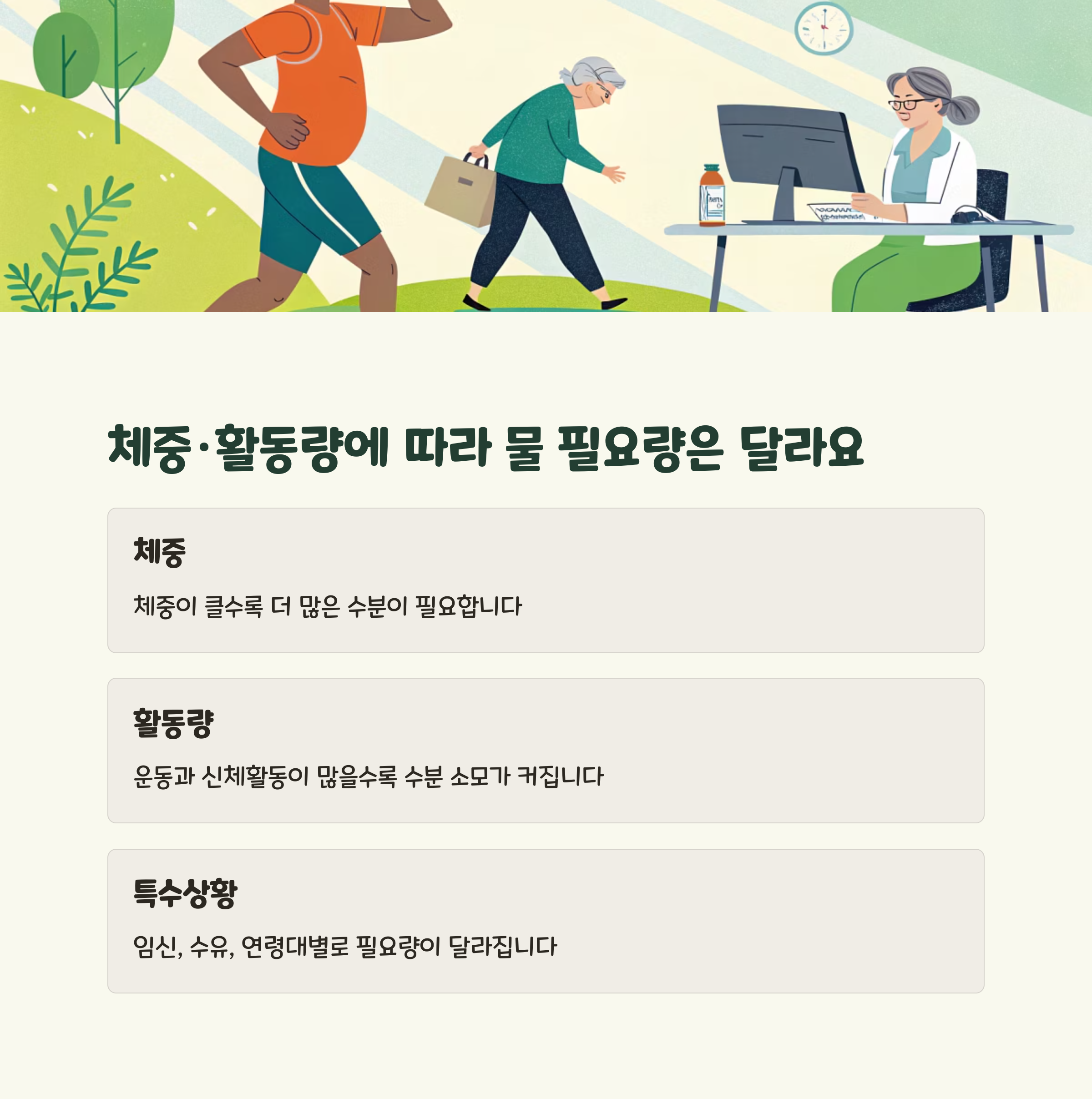 | 격한 활동 시 | +0.5~1리터 추가 필요 | 운동, 야외 활동 시 수분 손실 보완 필요 |