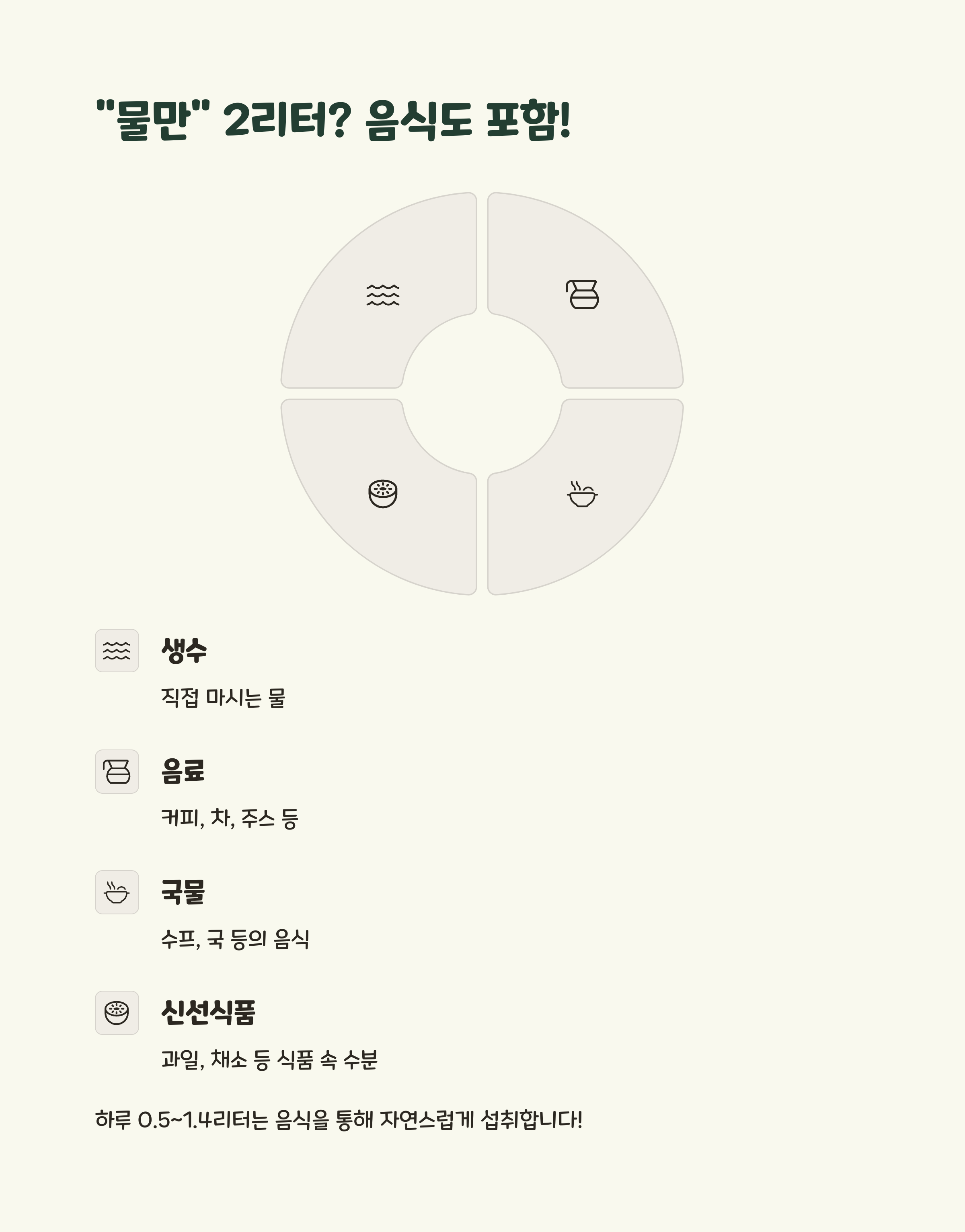 즉, 2리터는 총 수분 섭취량 기준이지, 생수만을 의미하는 것은 아닙니다.