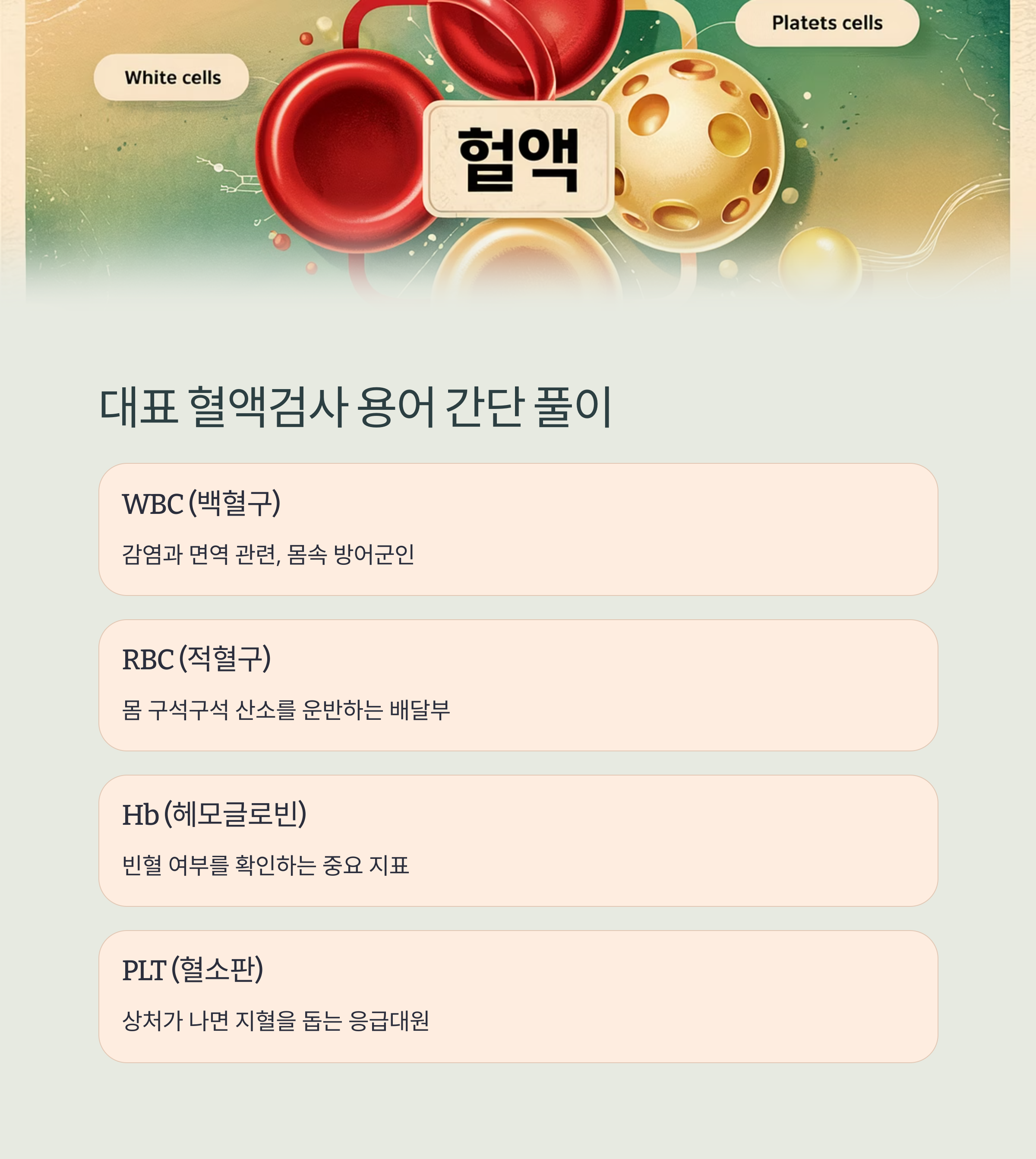 이 표는 기본 혈액검사에서 자주 등장하는 항목들입니다.