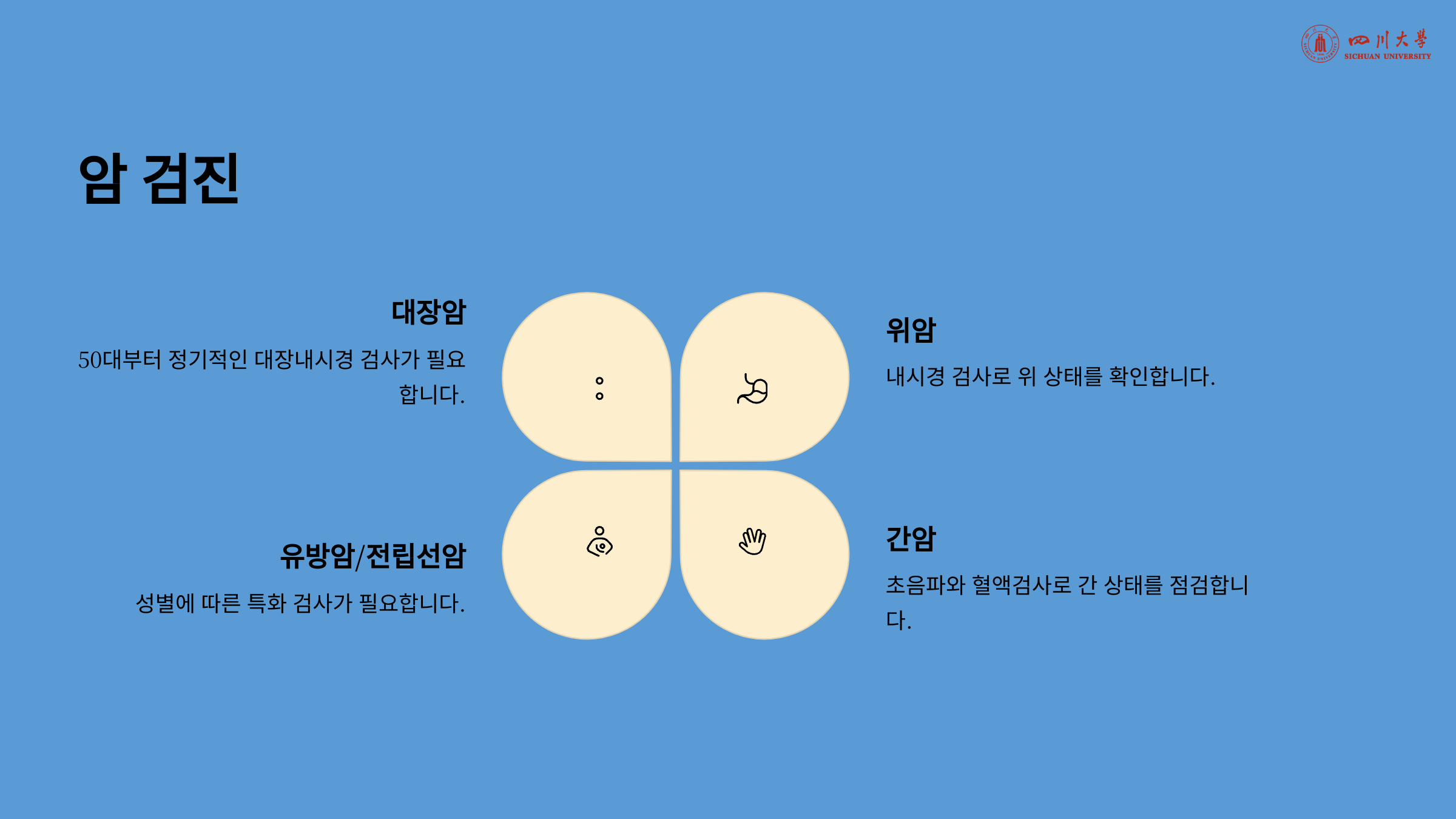 "암은 조기에 발견할수록 완치 가능성이 높습니다."