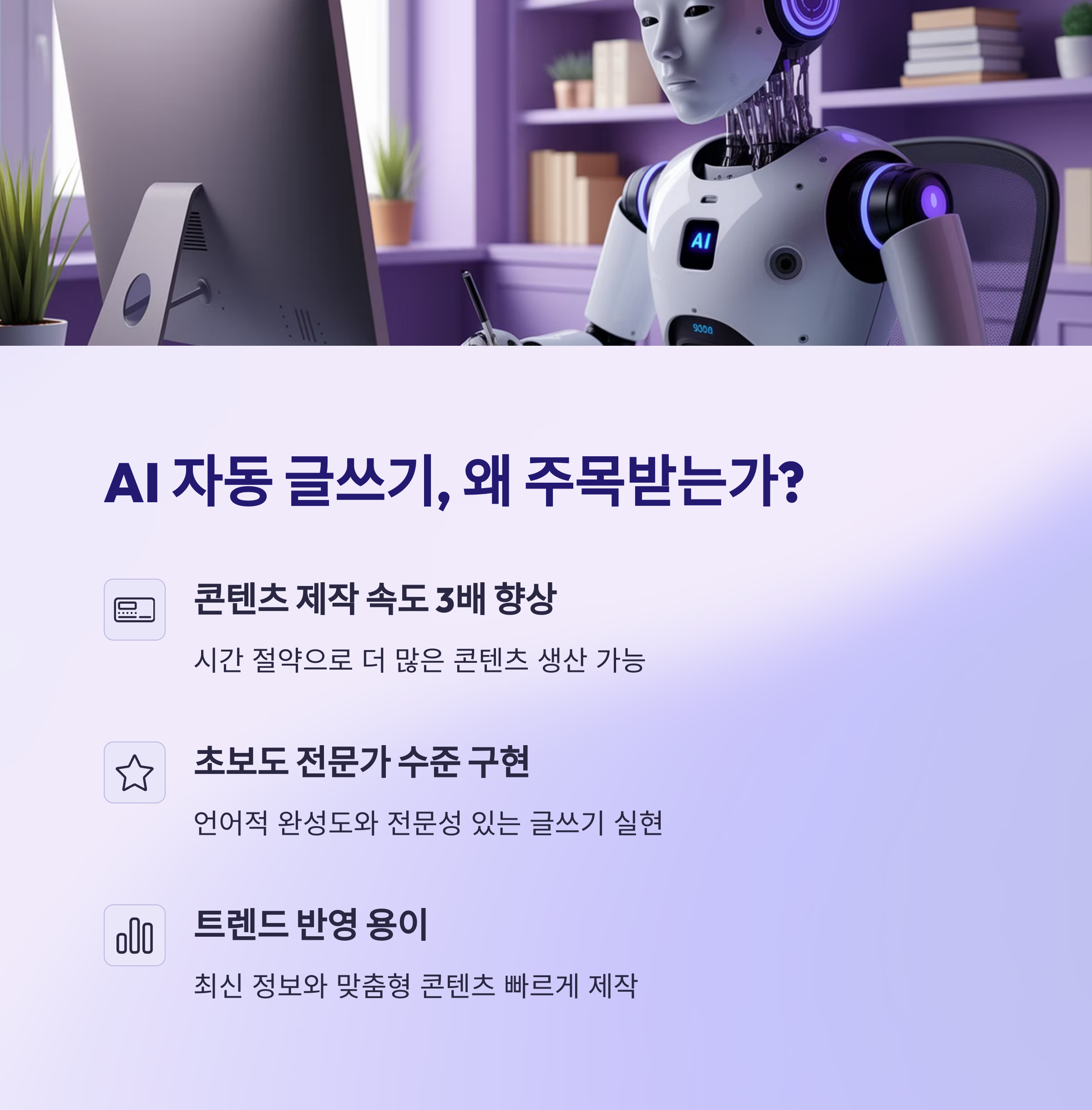 | 자동화된 글쓰기 도구로 시간 절약 가능 | 키워드 위치 및 밀도 고려한 작성 방식 | 경쟁도 낮은 키워드 선점이 핵심 |