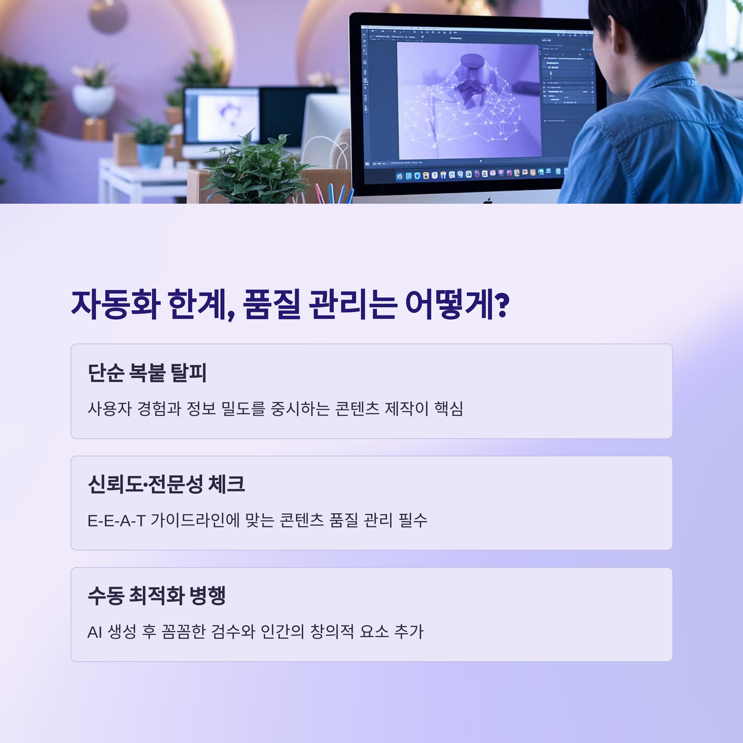| 초안 이후 인간적인 다듬기 필수 | 구체적 키워드가 더 높은 효과 발휘 | 콘텐츠 품질과 키워드 최적화의 균형 |